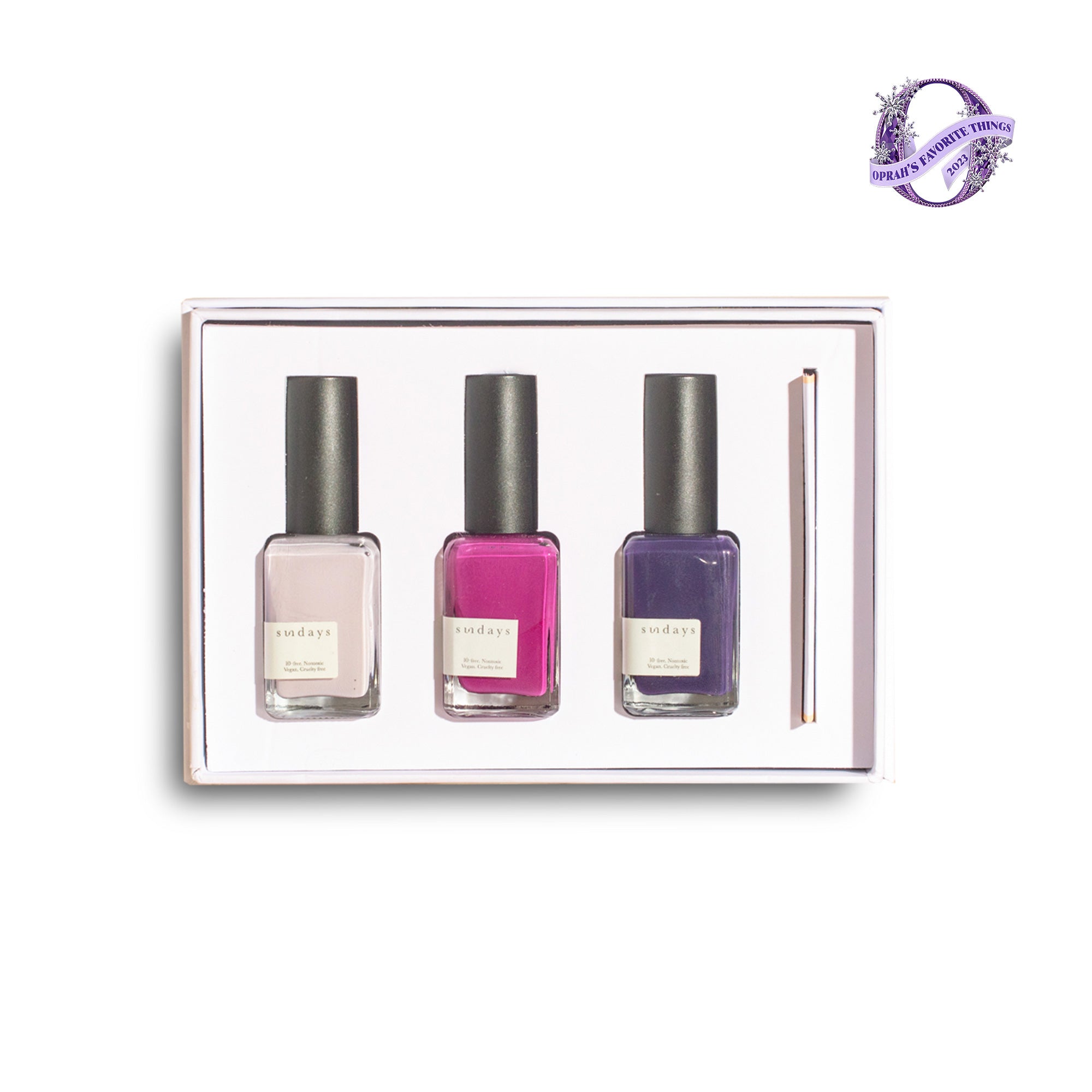 The Purple Box features three of the most popular purple shades, light No. 5 and vibrant No. 23 and deep J. 01, that are the perfect accessory to have, both at parties and in professional spaces, to navigate the every season with grace. All gift boxes are packaged with a love letter.