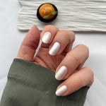 A glazed white pearl with a moonlike shine and a soft finish. It is a very versatile color perfect to wear to a celebration like a wedding or a glamorous party night. It also has a centering energy and goes well with your yoga outfit.